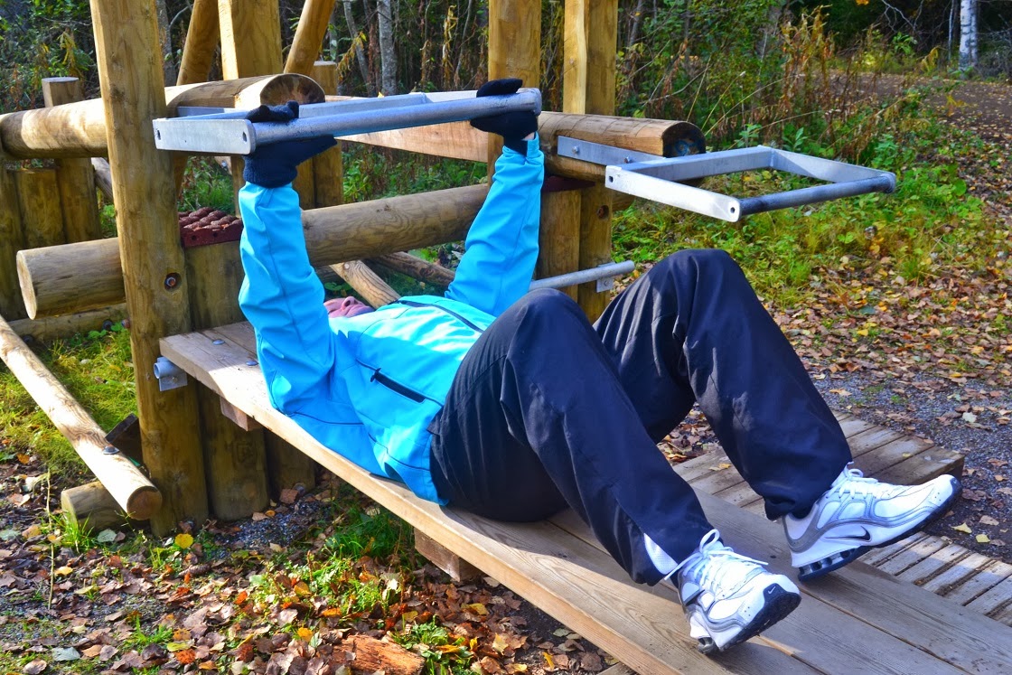 Pururadalla on sijoitettu lihaskuntotreeniä ajateltuna treenipaikkoja. Tässä tehdään pystypunnerrusta tukilla.